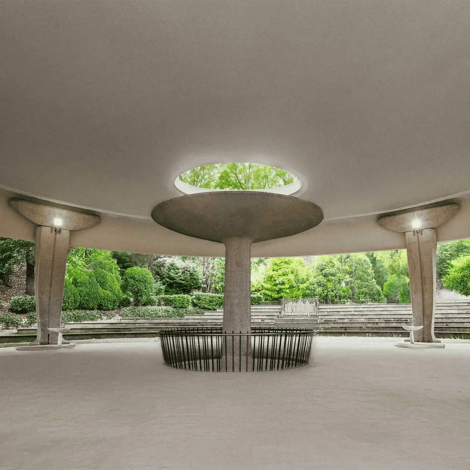 Nel cuore della città, la Fonte Bonifacio VIII è un luogo raccolto, dove il verde del parco incontra l’eleganza dell’architettura moderna progettata da Luigi Moretti. Le sue strutture, caratterizzate da volumi curvi, porticati aperti e linee essenziali, si inseriscono con leggerezza nel paesaggio, creando un ambiente armonioso e accogliente.