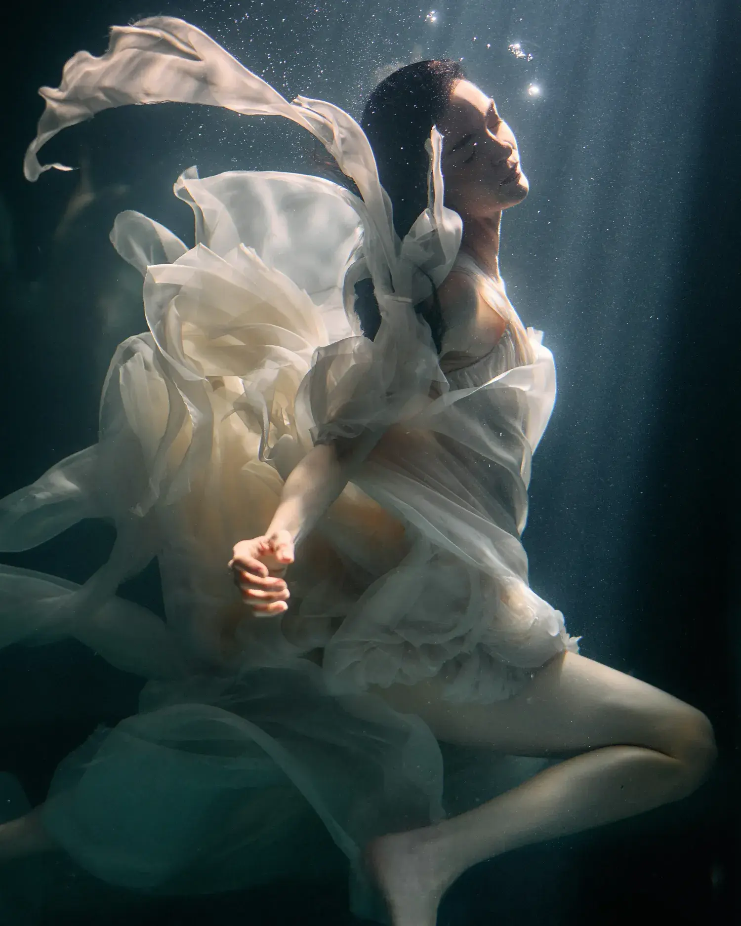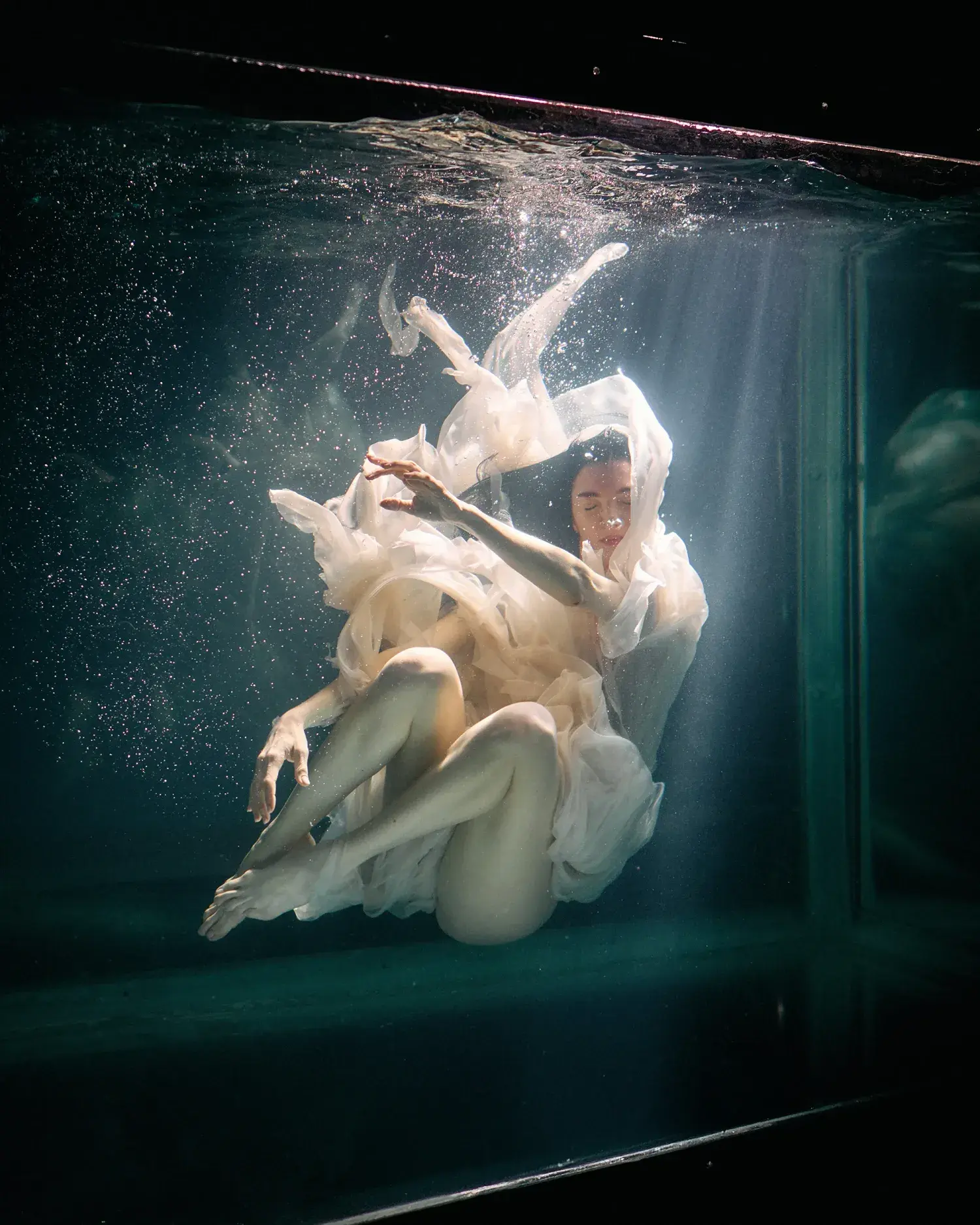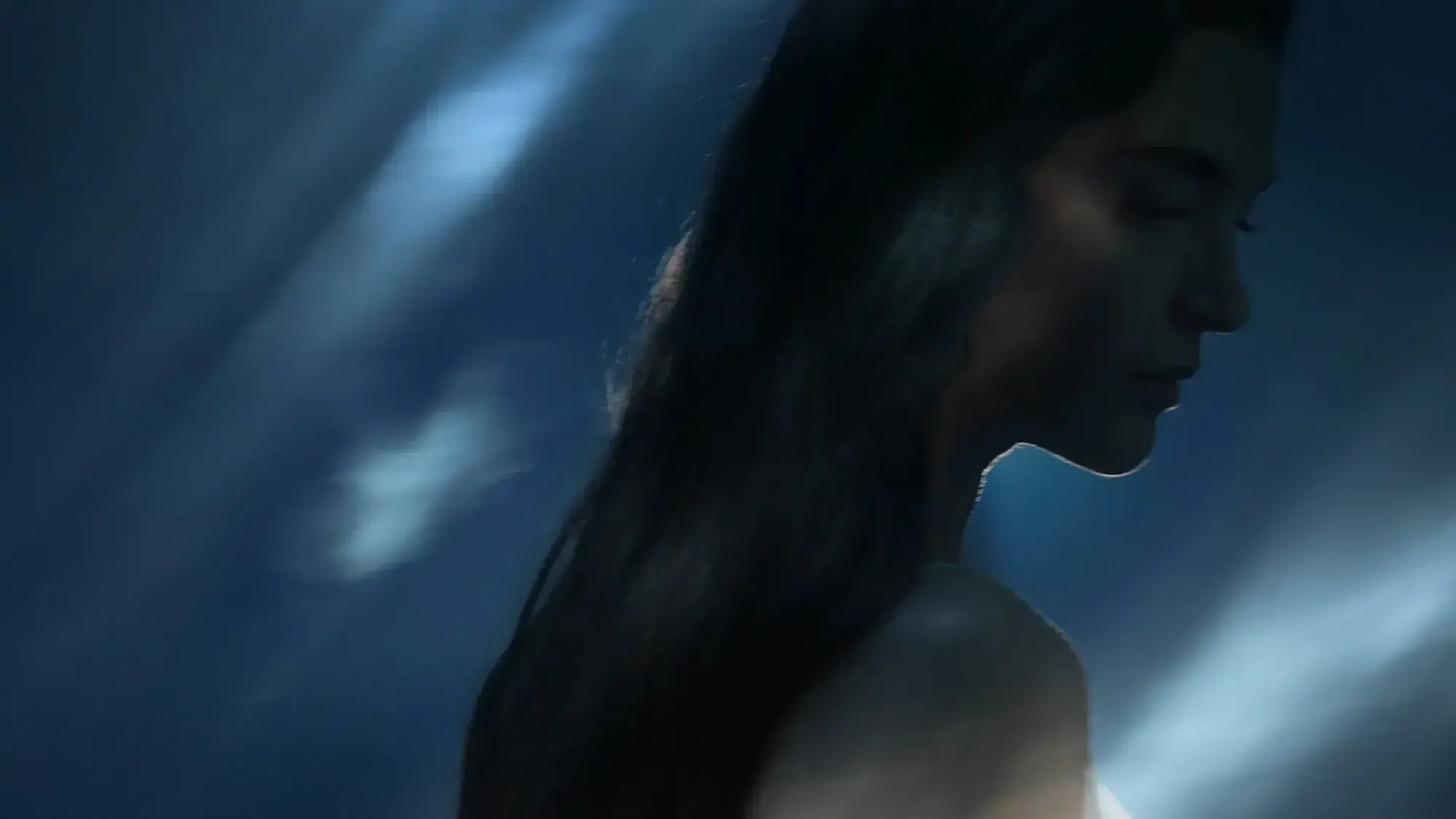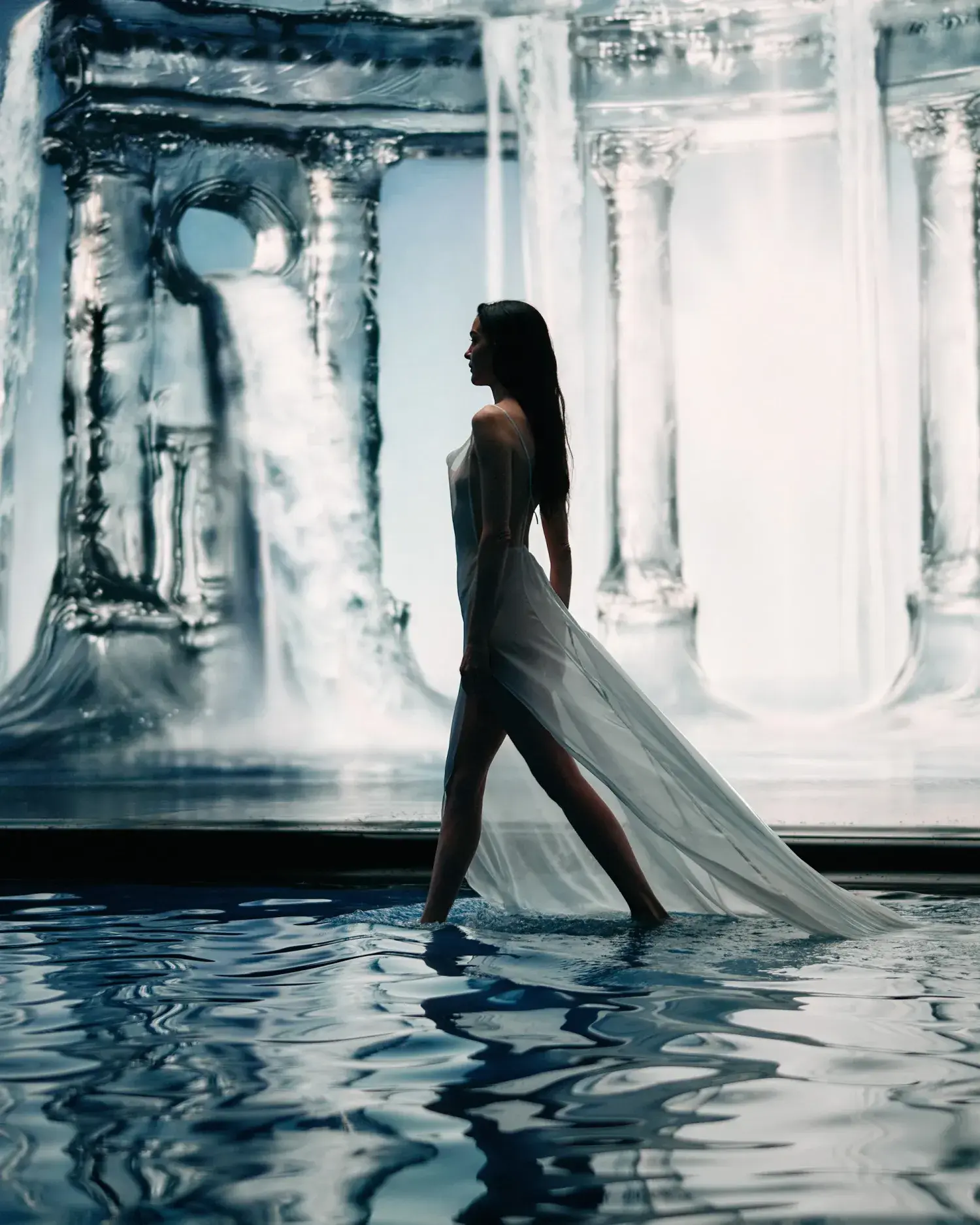 Intorno alla ninfa si apre un universo sospeso, fatto di luce, riflessi e materia liquida. È una dimensione onirica, parallela, dove tutto sembra esistere in uno stato di equilibrio perfetto. La luce avvolge ogni cosa con una presenza limpida, luminosa, precisa; i riflessi attraversano lo spazio e ne diventano parte, mentre l’acqua non è più soltanto elemento naturale, ma energia, tensione, atmosfera.