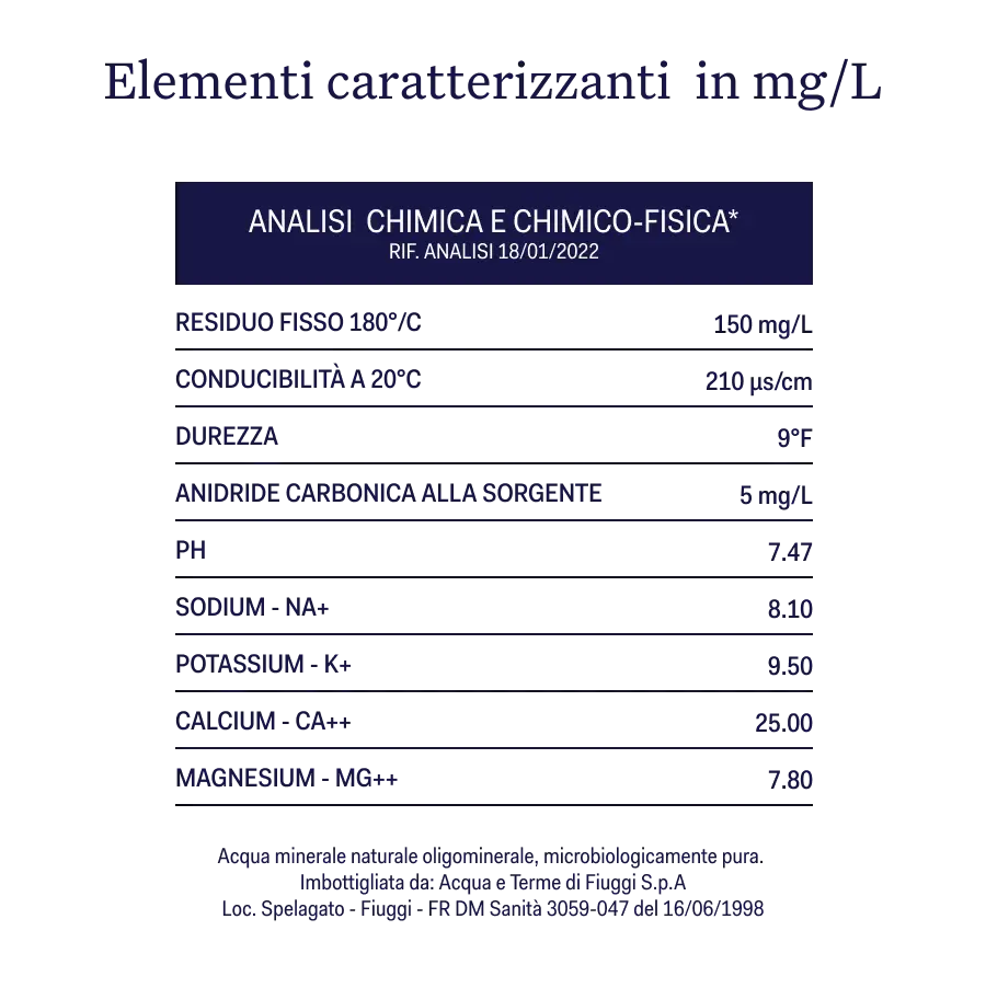 Acqua Fiuggi è un’acqua oligominerale unica, frutto delle sue due sorgenti: Fonte Bonifacio VIII e Fonte Anticolana. Grazie alla sua composizione minerale equilibrata, favorisce l’eliminazione delle tossine e aiuta l’organismo a ritrovare equilibrio e leggerezza. Assunta quotidianamente, sostiene il benessere naturale dell’organismo.