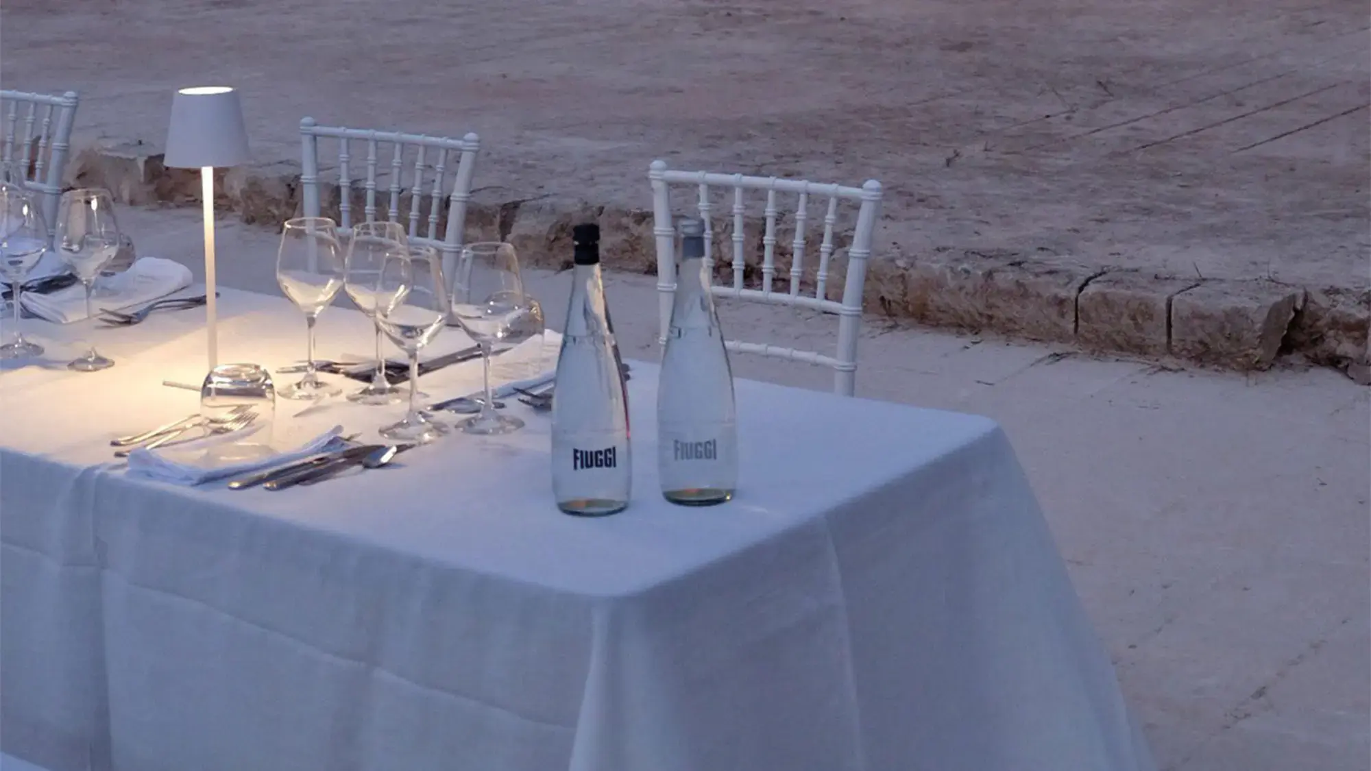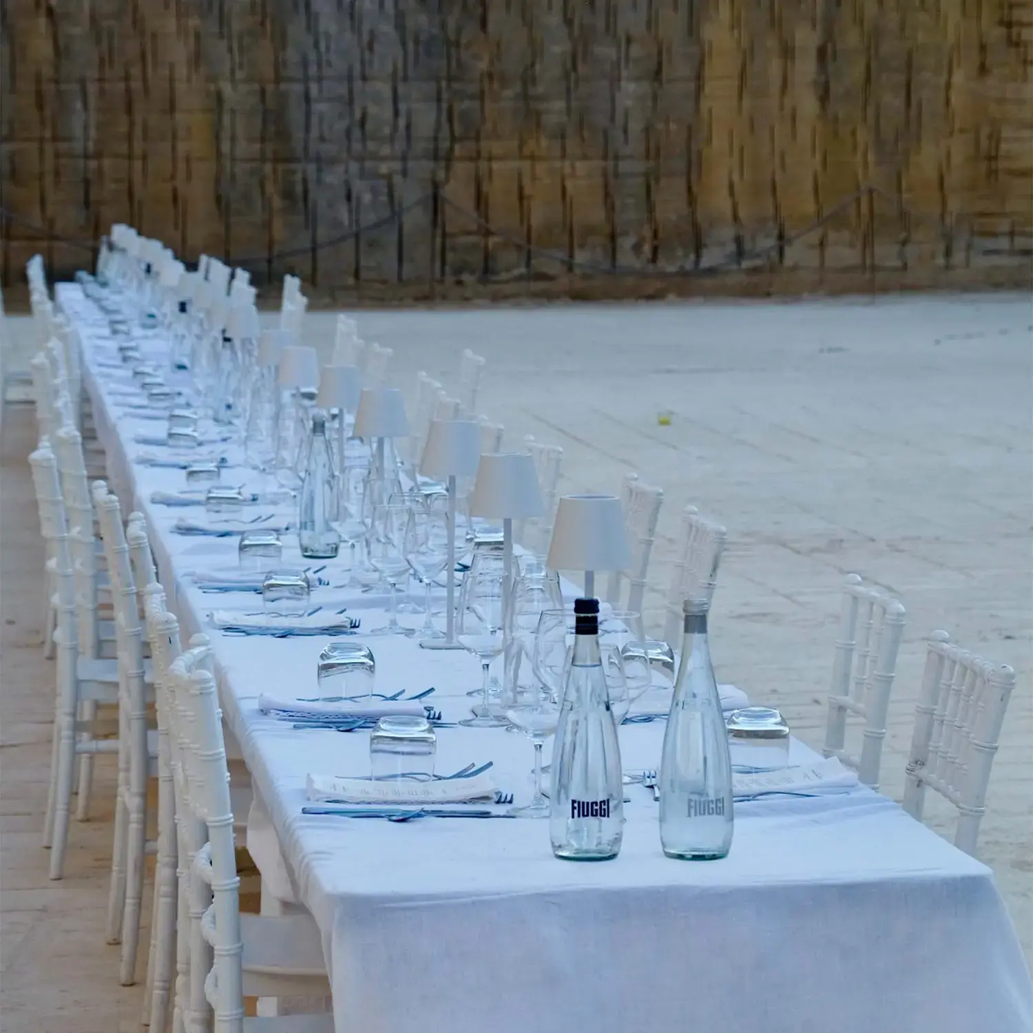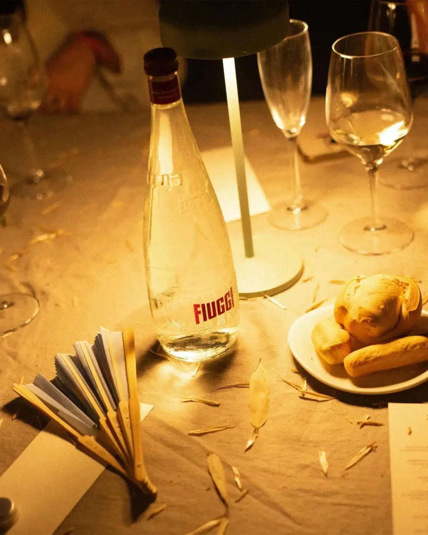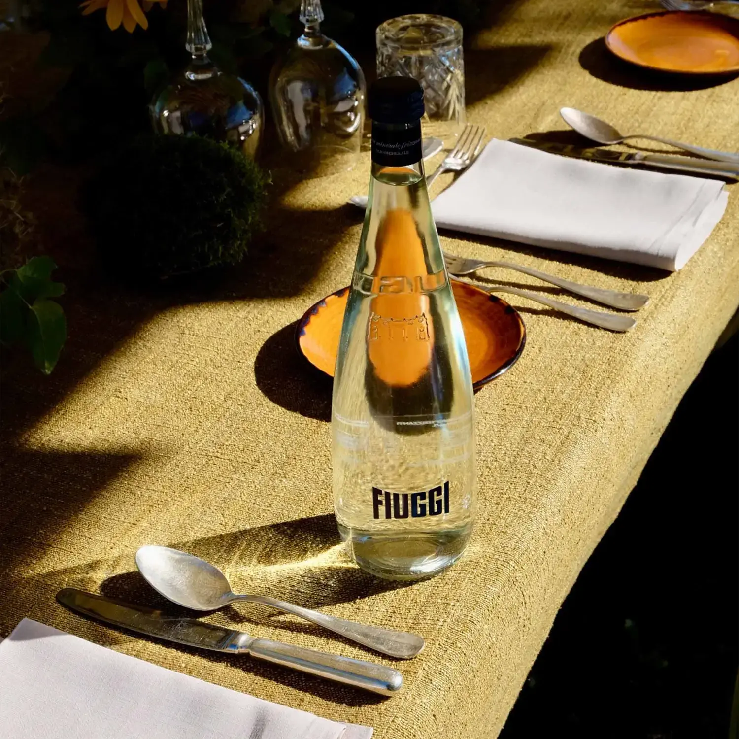 Le bottiglie di Acqua Fiuggi completano la mise en place con la loro purezza e un’estetica che si distingue per equilibrio e raffinatezza. La forma slanciata della bottiglia, il vetro trasparente e l’etichetta dal design minimal si integrano perfettamente negli allestimenti di Tavolata, contribuendo all’armonia della tavola senza mai sovrastarla.